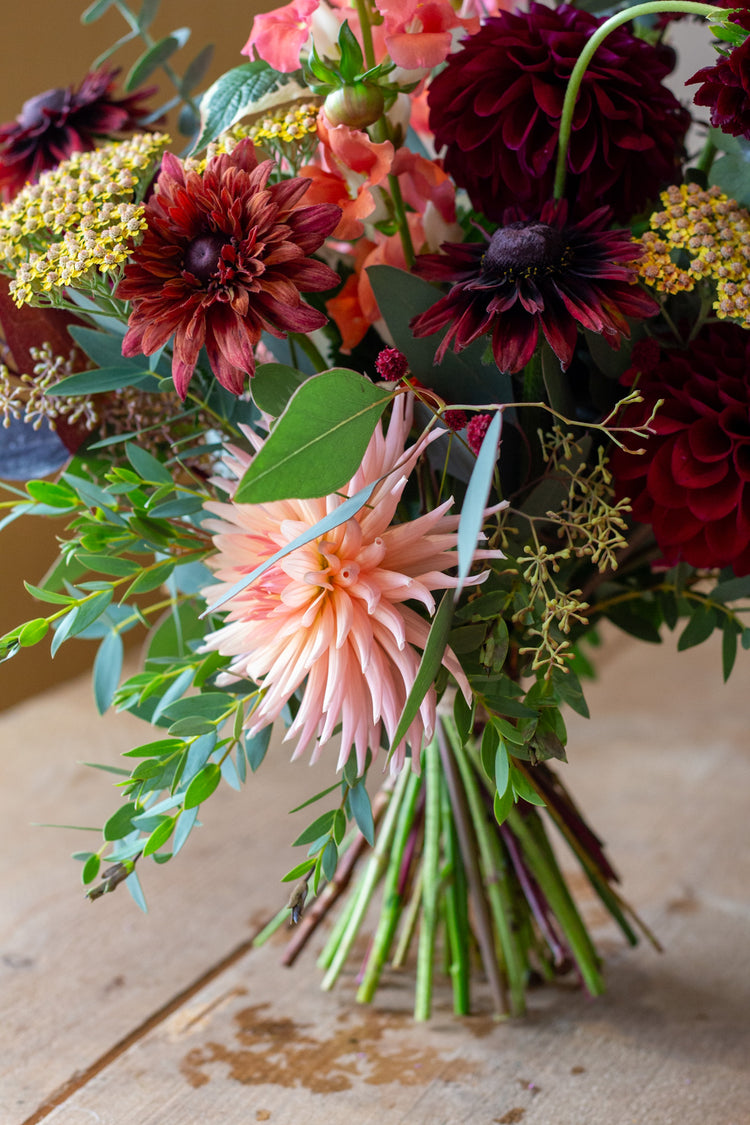 Strong, rich jewel toned flowers form this bridal collection, combined with a mixture of textured foliage to create a beautiful hand tied bouquet which has plenty of movement and style.