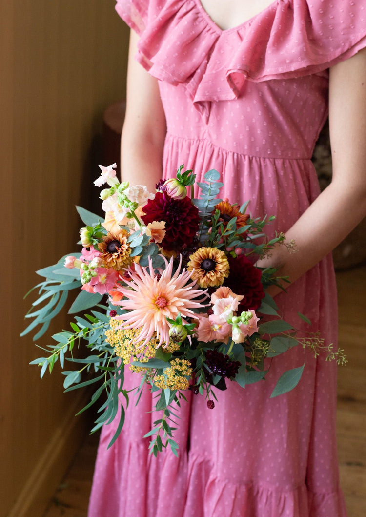 Made to compliment our Bridal bouquet, this smaller bridesmaid's bouquet is made in the same selection of bold jewel toned flowers, combined with a mixture of textured foliage to create a beautiful hand tied bouquet. Slightly smaller in size to the Bridal bouquet.
