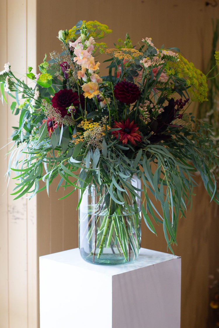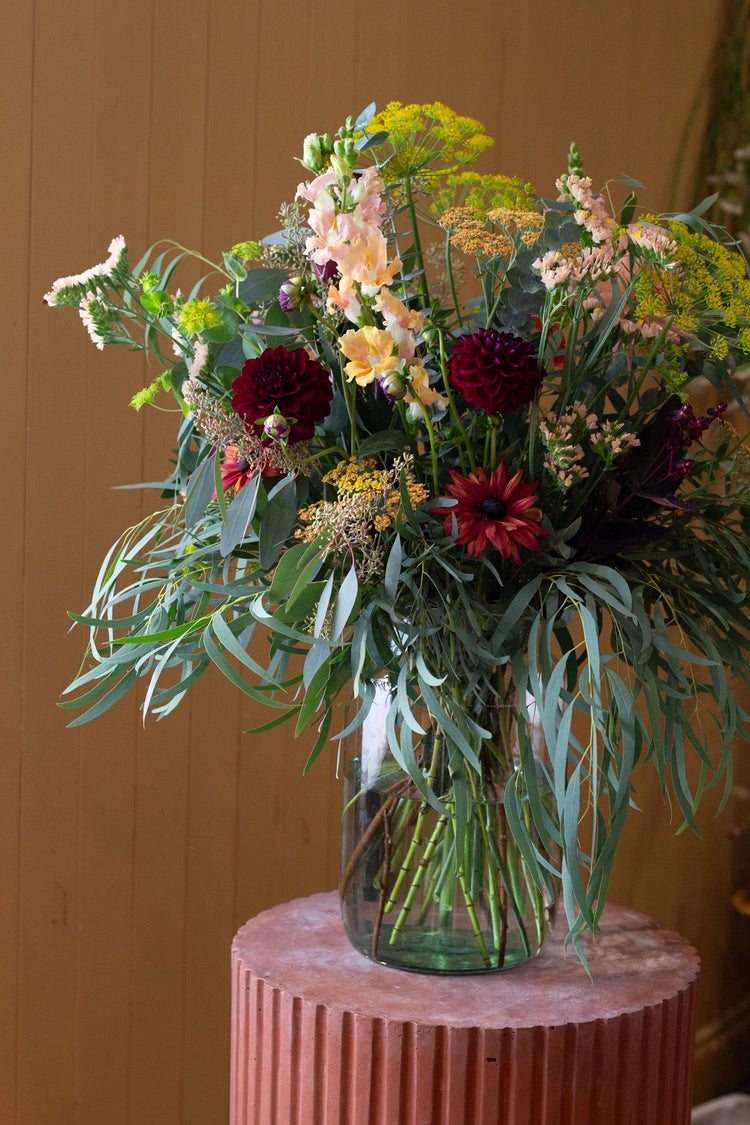 Made in a large clear glass vase. Vase size approx. 32cm tall, with flower arrangement the full height is approx. 85cm tall.
