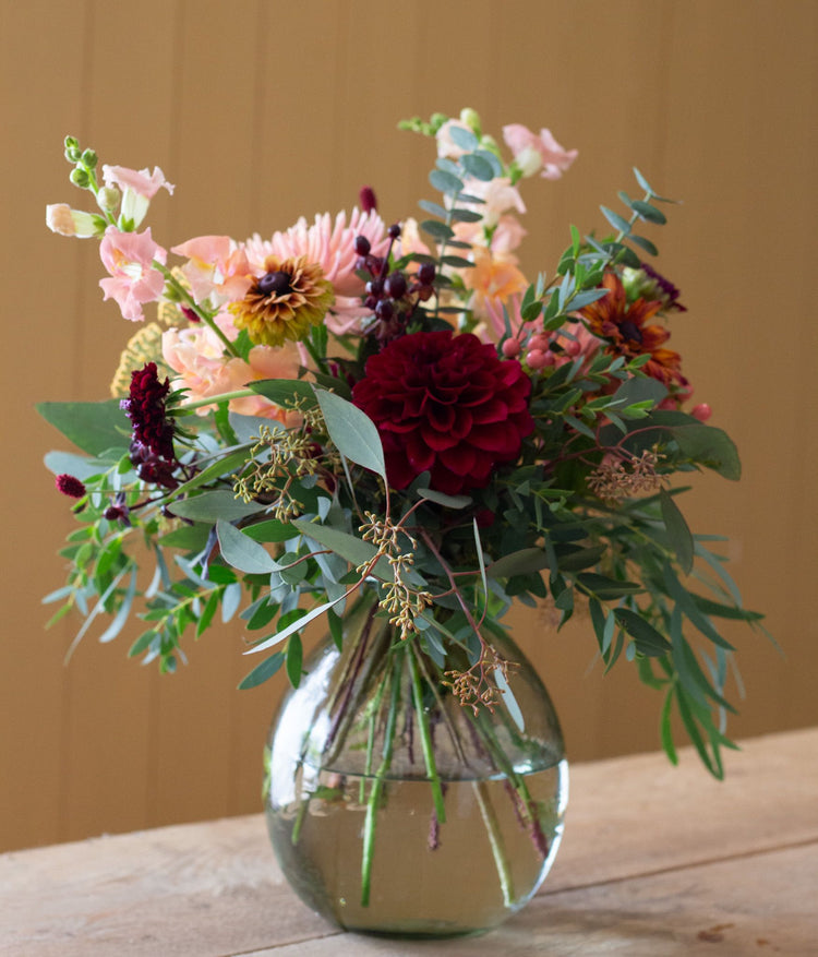 Made in a round recycled glass vase. Vase size approx. 17cm tall, with flower arrangement the full height is approx. 25cm tall.