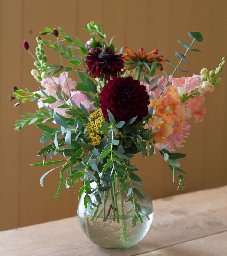 Made in a round recycled glass vase. Vase size approx. 17cm tall, with flower arrangement the full height is approx. 25cm tall.