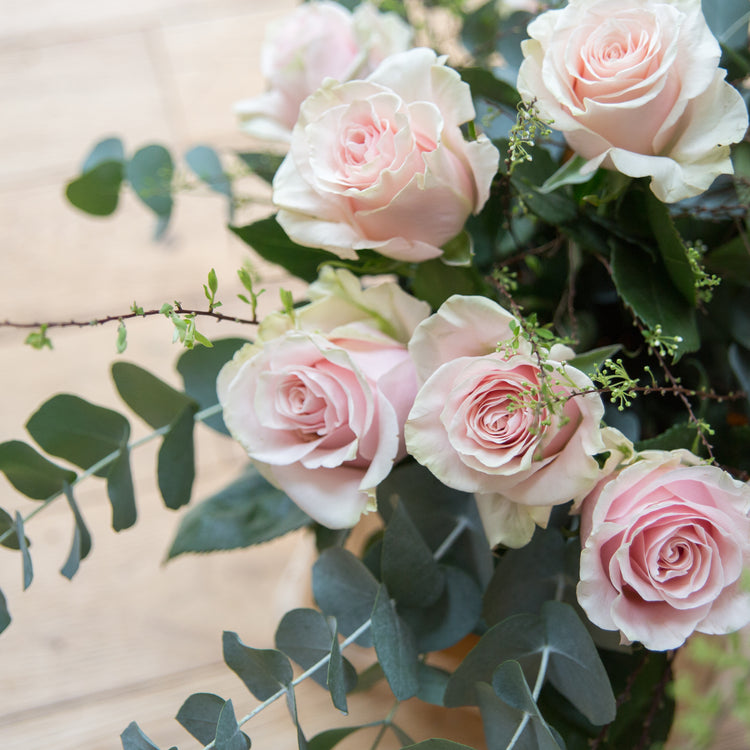 A gorgeous bouquet of 12x soft pink luxury roses tied with an abundance of eucalyptus and spirea branches.