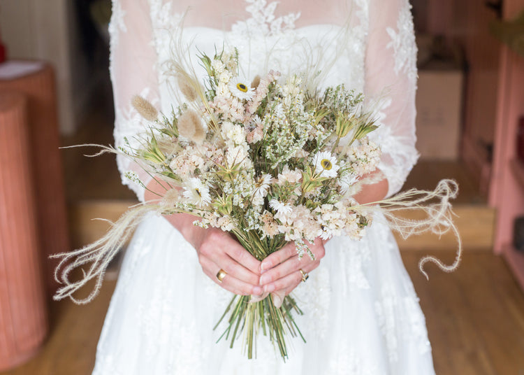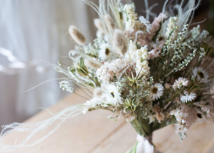 This pretty flower bouquet is made up of a vast array of dried flowers and foliage, all kept to neutral and white tones. The beauty of using dried flowers is that they will keep long after your wedding day.