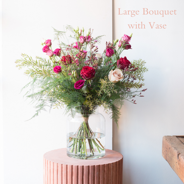 Three sizes available in this design; medium, large and luxurious. Available to buy with a clear glass vase with our large and lux sizes. All bunches gift wrapped.