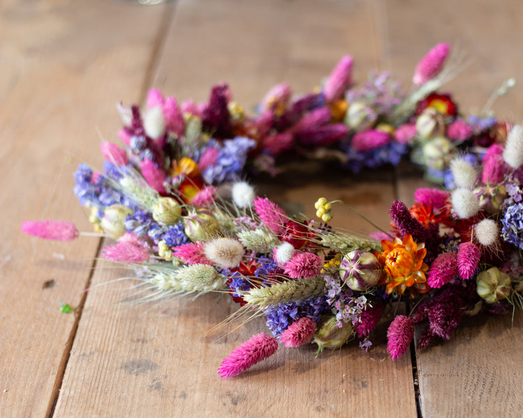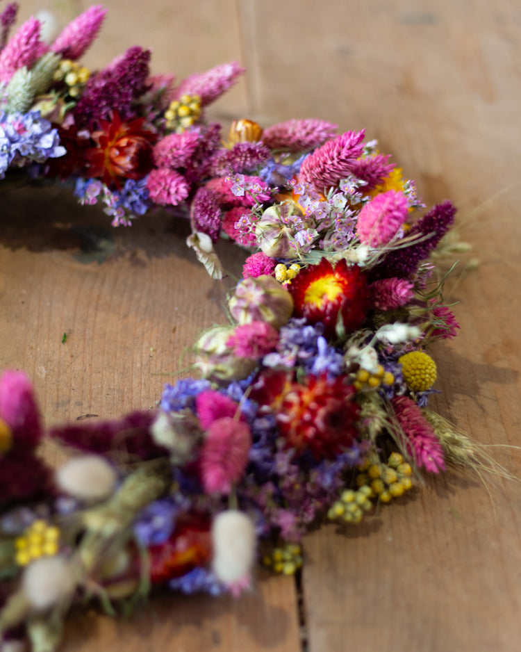 Summer is a gorgeous time of year to explore dried flowers and to learn how to make a beautiful wreath that will last and last. You will gain an understanding of basic floristry principles as well as a fun and informative ‘hands on’ practical session which allows you to put these principles into practice. You will learn how to construct a wreath base using natural materials, simple wiring techniques that ensure stems are held securely, wreath construction, methods for drying flowers at home and an introduction to colour relationships.