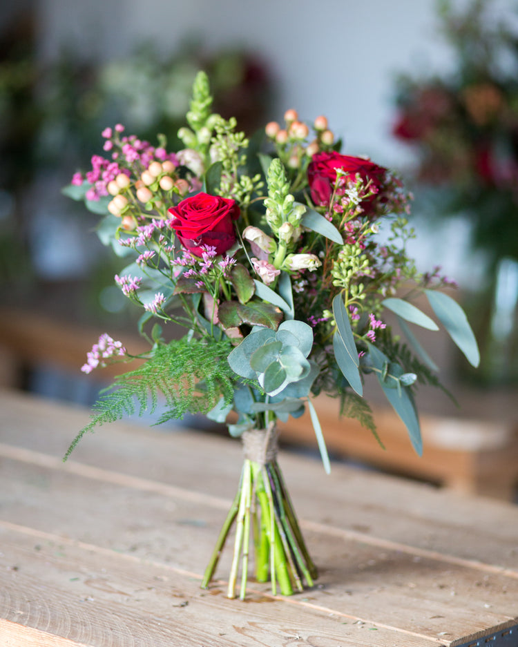 Reds, berries, foliage - perfect flowers for Christmas. Available in small, medium, large and lux. Lux version also available in a beautiful Garden Trading vase.
