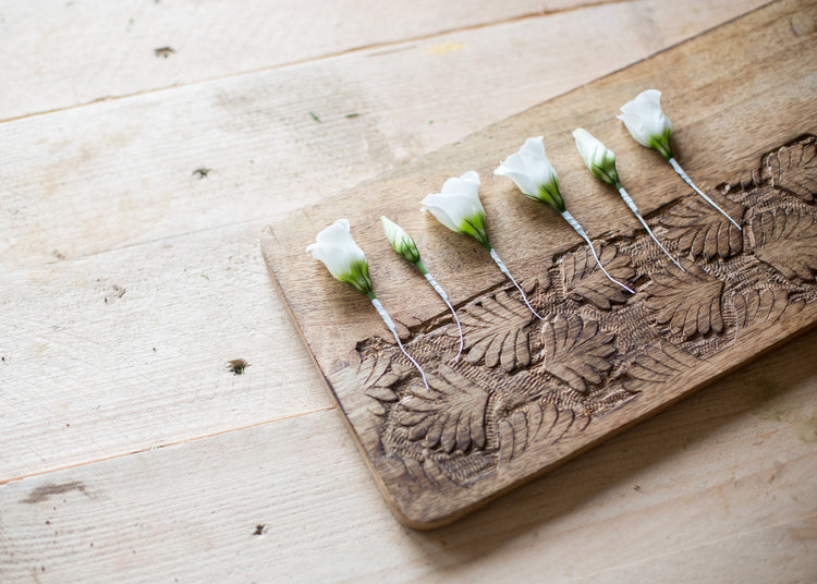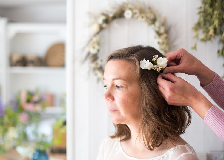 Individually wired white flowers which can be pinned into hair with a grip or pins. We provide 7 - 9 flower heads which can be separately placed into your hair.