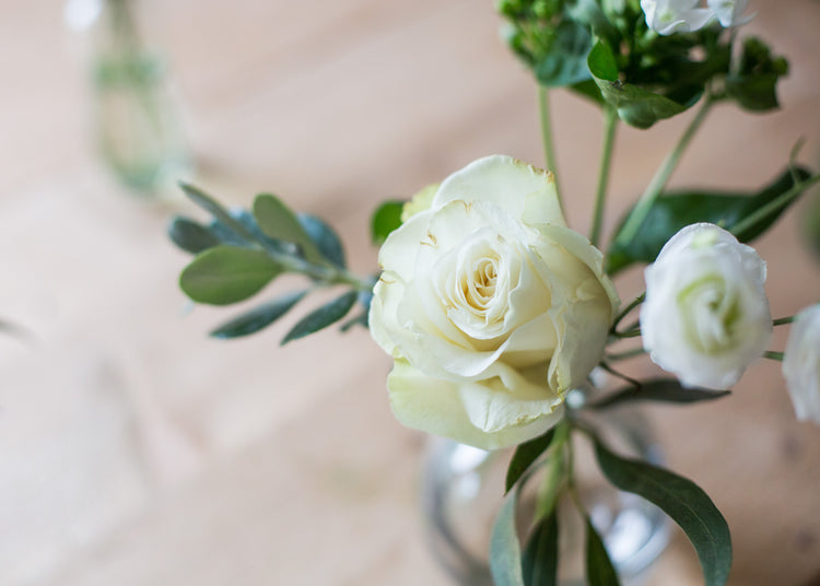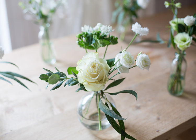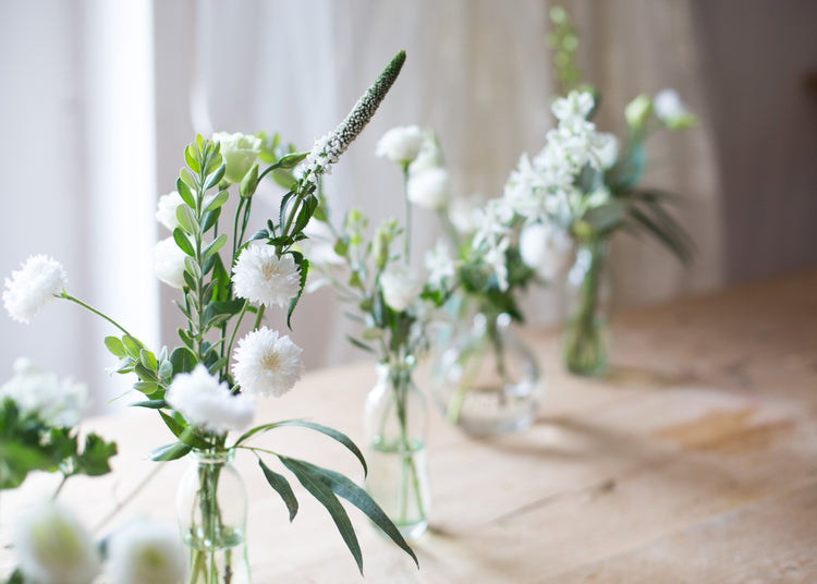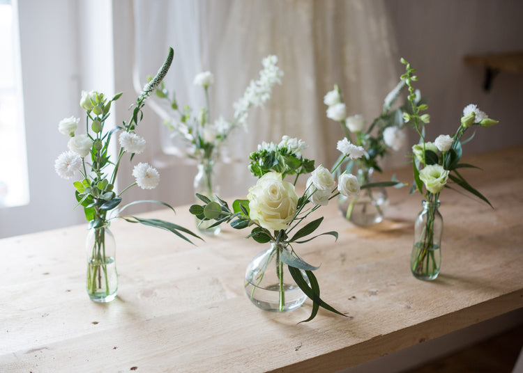 We have a large selection of bud vases which we fill with stems of gorgeous flowers which can be placed on table centres or dotted around your wedding venue as you wish. Made using complimentary flowers to our Whites and Greens Bridal bouquet.