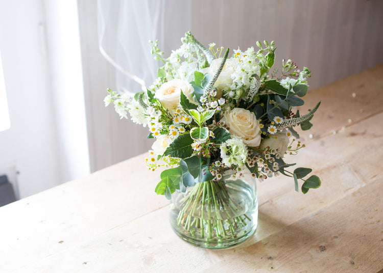 Our perfectly sized vases can sit on table centres and won't obstruct any guest's view across the table. Can also be placed on a registrar's table, on a bar or anywhere you like in your venue to decorate. Made using complimentary flowers to our Whites and Greens Bridal bouquet.