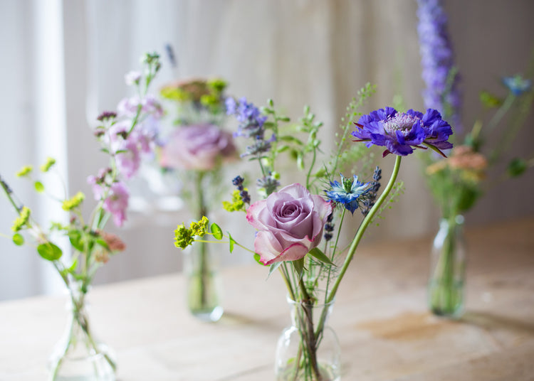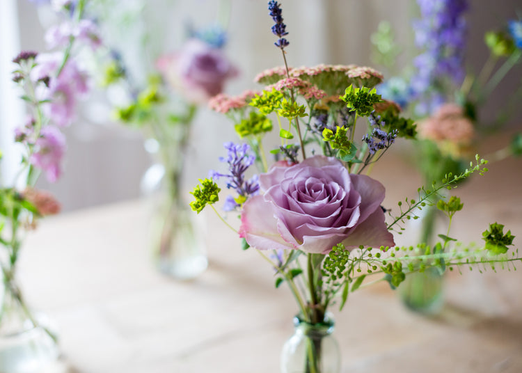 We have a large selection of bud vases which we fill with stems of gorgeous flowers which can be placed on table centres or dotted around your wedding venue as you wish. Made using complimentary flowers to our Soft Pastels Bridal bouquet.