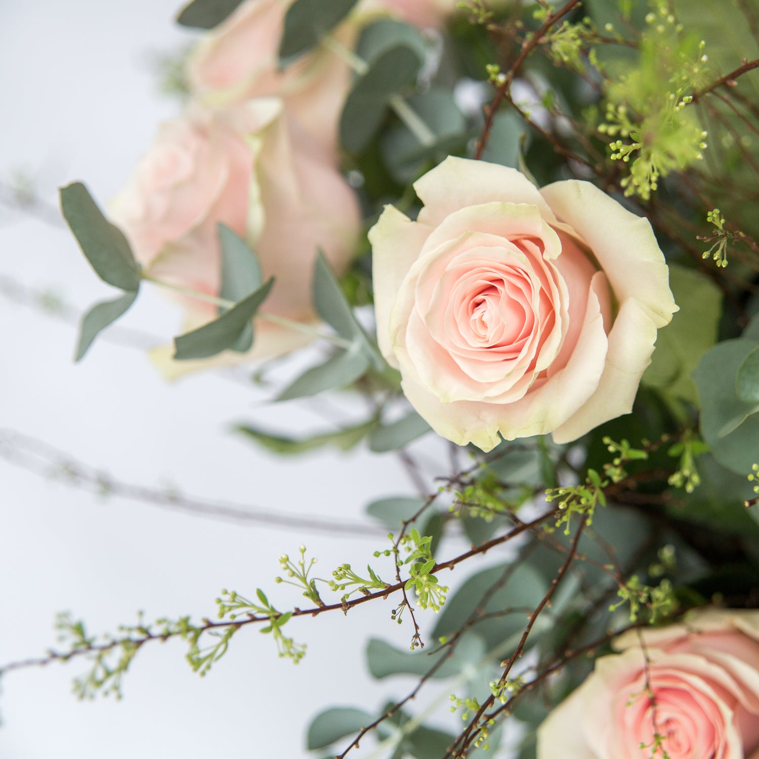A gorgeous bouquet of 12x soft pink luxury roses tied with an abundance of eucalyptus and spirea branches.